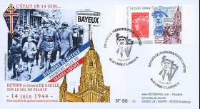 N°DG13-1T1 : FDC FRANCE "June 14, 1944-2013 : 69th anniversary of the come back of General de Gaulle in the land of France - Speech of Bayeux (France), First town of France liberated - World War II 1939-45 / June 14, 2013 : Inauguration of the Information Point and Permanent Exhibition 'DE GAULLE, Memory for the Future' in Scorbé-Clairvaux (France)" (TYPE 1) 2013 :