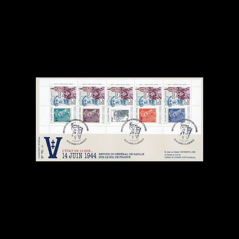 N°DG13-3T2 : Maxi FDC FRANCE "June 14, 1944-2013 : 69th anniversary of the come back of General de Gaulle in the land of France - Speech of Bayeux (France), First town of France liberated - World War II 1939-45 / June 14, 2013 : Inauguration of the Information Point and Permanent Exhibition 'DE GAULLE, Memory for the Future' in Scorbé-Clairvaux (France)" (TYPE 2) 2013 :