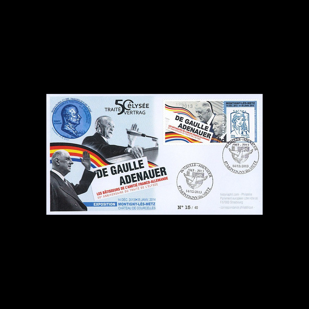 N°DG13-9T4 : FDC FRANCE "December 14, 2013 - January 5, 2014 : Exhibition in Montigny-lès-Metz (France) - DE GAULLE & ADENAUER : The builder of the Franco-German Friendship / 1963-2013 : 50th anniversary of the Elysée Treaty" (TYPE 4) 2013 :