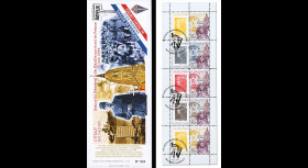 This commemorative issue is composed of a DIPTYCH (2 values at 1.16 € - creation and engraving Sarah Lazarevic), a SOUVENIR BLOCK (2 values at 1.16 € - graphic design by Bruno Ghiringhelli) and a PRESTIGE BLOCK of 4 stamps at 5.00 € with old dies of General de Gaulle's recess engraving stamps (Patte & Besset layout).
