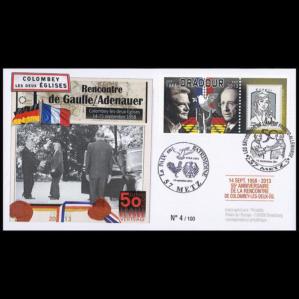 - Picture postmark Metz "DE GAULLE & ADENAUER, The builders of Franco-German Friendship - 50th anniversary of the Elysée Treaty" 14.09.2013