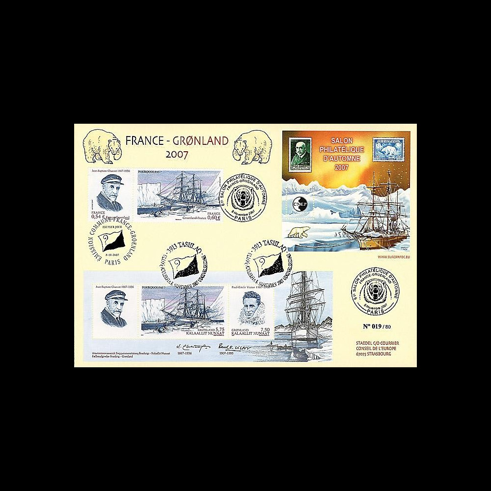 N°CHARC07-1 : Maxi FDC 'France - Groenland 2007' avec affranchissement mixte - France : diptyque 0,54 EUR 'Charcot' - 0,60 EUR 'Pourquoi-pas?' oblit. '1er Jour Paris' et 'Salon philatélique d'Automne' (type Ours) 08.11.07 + bloc dentelé CNEP - Groenland : bloc-feuillet 'Charcot' - 5,75 'Pourquoi-pas?' - 7,50 'Paul-Emile Victor' oblit. '1er Jour Tasiilaq' 08.11.07. Tirage N°1/80 Rare >> Voir tous les produits "Polaire" Émission commune France-Groenland au Salon philatélique d'Automne 2007 Invitée d'honneur du Salon philatélique d'Automne 2007qui s'est tenu du 8 au 11 novembre à Paris, la Poste groenlandaise a constituée la principâle attraction de la manifestation. En effet, la France et le Groenland se sont associés pour émettre une série commune de timbres en hommage à deux grands explorateurs des pôles, Jean-Baptiste Charcot (1867-1936) et son légendaire bateau le 'Pourquoi-pas?', ainsi que Paul-Emile Victor (1907-1995).