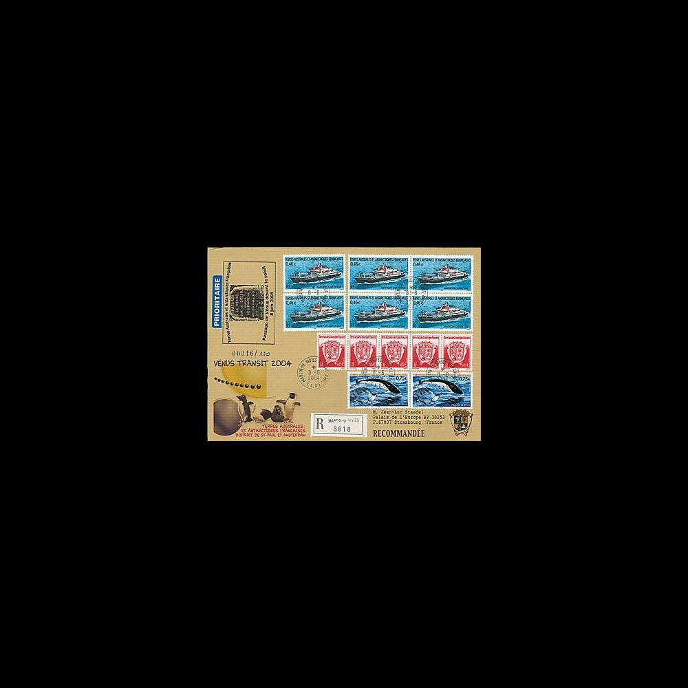Pli RECOMMANDÉ «Vénus Transit 2004» oblitération de la Base Martin-de-Vivies, St Paul et Amsterdam 8.6.04 + cachet TAAF «Passage de Vénus devant le Soleil» + cachet d'arrivée «Conseil de l'Europe» au verso sur TP 6x 0,46 "Marion Dufresne" + 2x 0,75 "Dauphin du Péron" + 5x «Armoiries TAAF» Tirage N°1/110