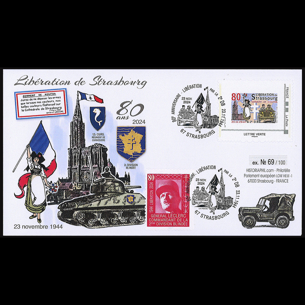 - Postage France Personalized stamp (TPP) Green letter 20g "80 years Liberation of Strasbourg 1944-2024" + red perforated label (cinderella) "80 years Liberation 1944-2024 - General LECLERC, commander of the 2nd AD"