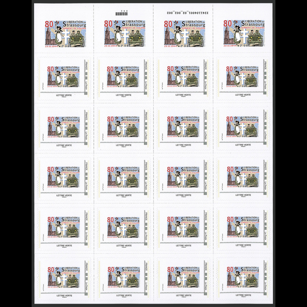 - illustration: Strasbourg Cathedral, Alsatian woman holding a tricolor bouquet, Cross of Lorraine of the Resistance, General Leclerc and soldier of the 2nd Armored Division (2nd DB) in a Jeep.