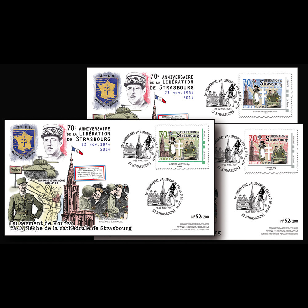 - Postage for the series of 3 personalized stamps (TPP): Green Letter, Priority Letter, and World Letter 20g "70 Years of the Liberation of Strasbourg 1944-2014"