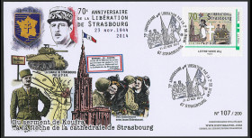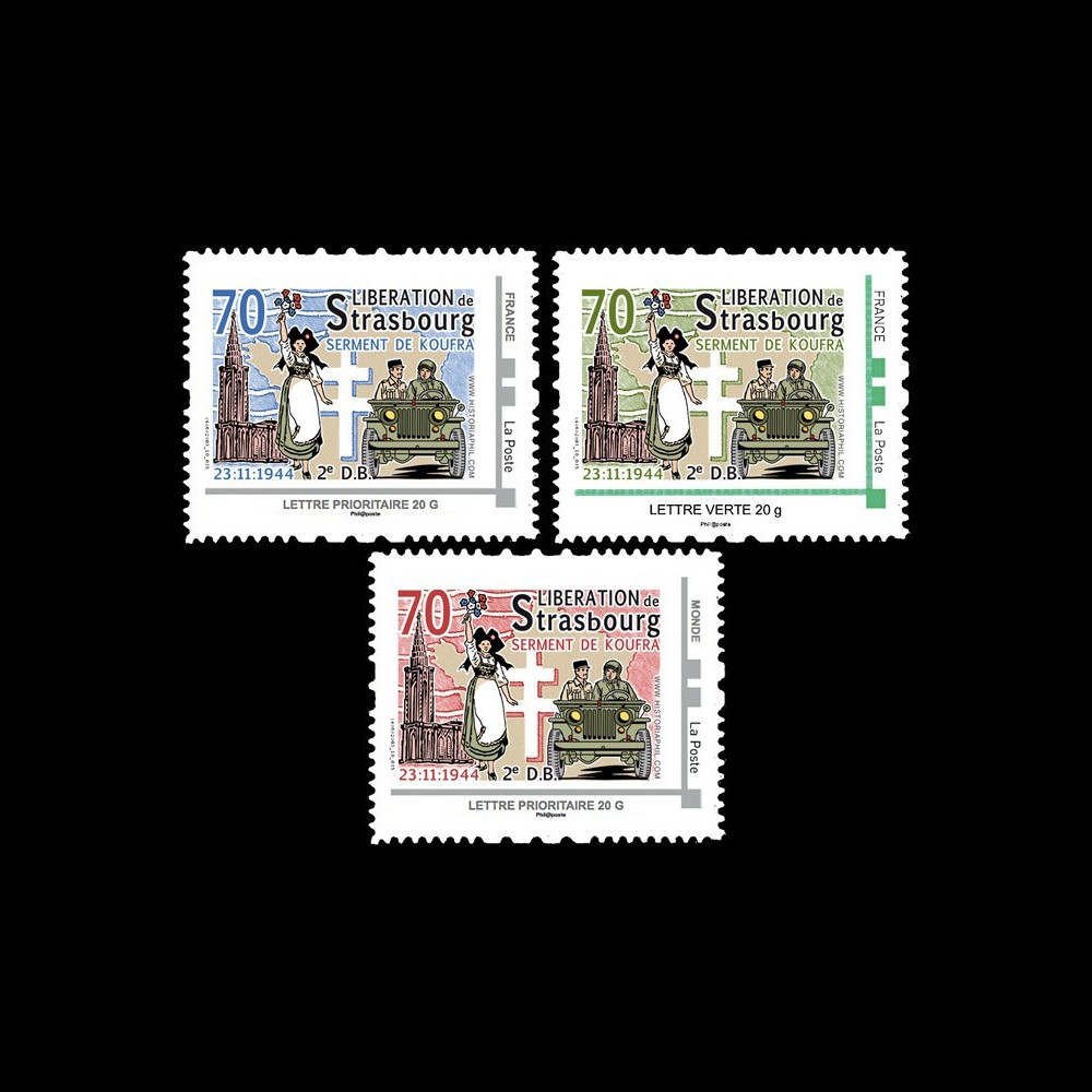 LIB14-STR1/3N : FRANCE 2014 - Set of 3 Personalized stamps IDTimbre© (Priority Letter, Green Letter and World 20g) "70th anniversary of the Liberation of Strasbourg by the 2nd Armoured Division 23.11.1944 - Oath of Kufra - Cathedral, Alsatian, Jeep, Cross of Lorraine"