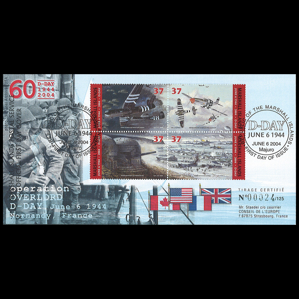 - Postage Marshall Islands, Block of 4 x 37c "June 6, 1944-2004, Allied Landings in Normandy. Horsa gliders, Typhoon 1B (GB) and P-51B Mustang (USA) fighters, German artillery, Pointe du Hoc and amphibious landing"