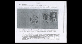 Libération de Paris, août 1944 25 août 1944 : La 2e D.B. du général Leclerc entre dans Paris, de Gaulle s'installe au ministère de la guerre. 31 août 1944 : Le gouvernement Provisoire d'Alger est transféré à Paris. 1ère surcharge de la Libération de Paris : Timbres de service émis par les F.F.I. et utilisés par eux pour le courrier transporté par motocycliste. Une seule valeur : 1,50 Pétain surchargé d'une Croix de Lorraine. Ce timbre était accompagné d'une vignette bleue grand format à l'éffigie du général de Gaulle.. Oblitération par cachet F.F.I. Les enveloppes ainsi affranchies furent collectées après la Libération et vendues le 13 novembre 1944 au profit des F.F.I.