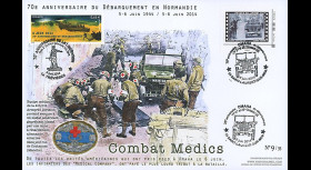 - France TVP Green Letter “Marianne the Committed” on perforated GREEN label stamp holder “80th anniv. of the Landing in Normandy“ illustrated cancellation Colleville-Sur-Mer “80th anniversary of the D-Day Landing - Omaha Beach - American cemetery cross and Patrouille de France“ June 5-6, 2024