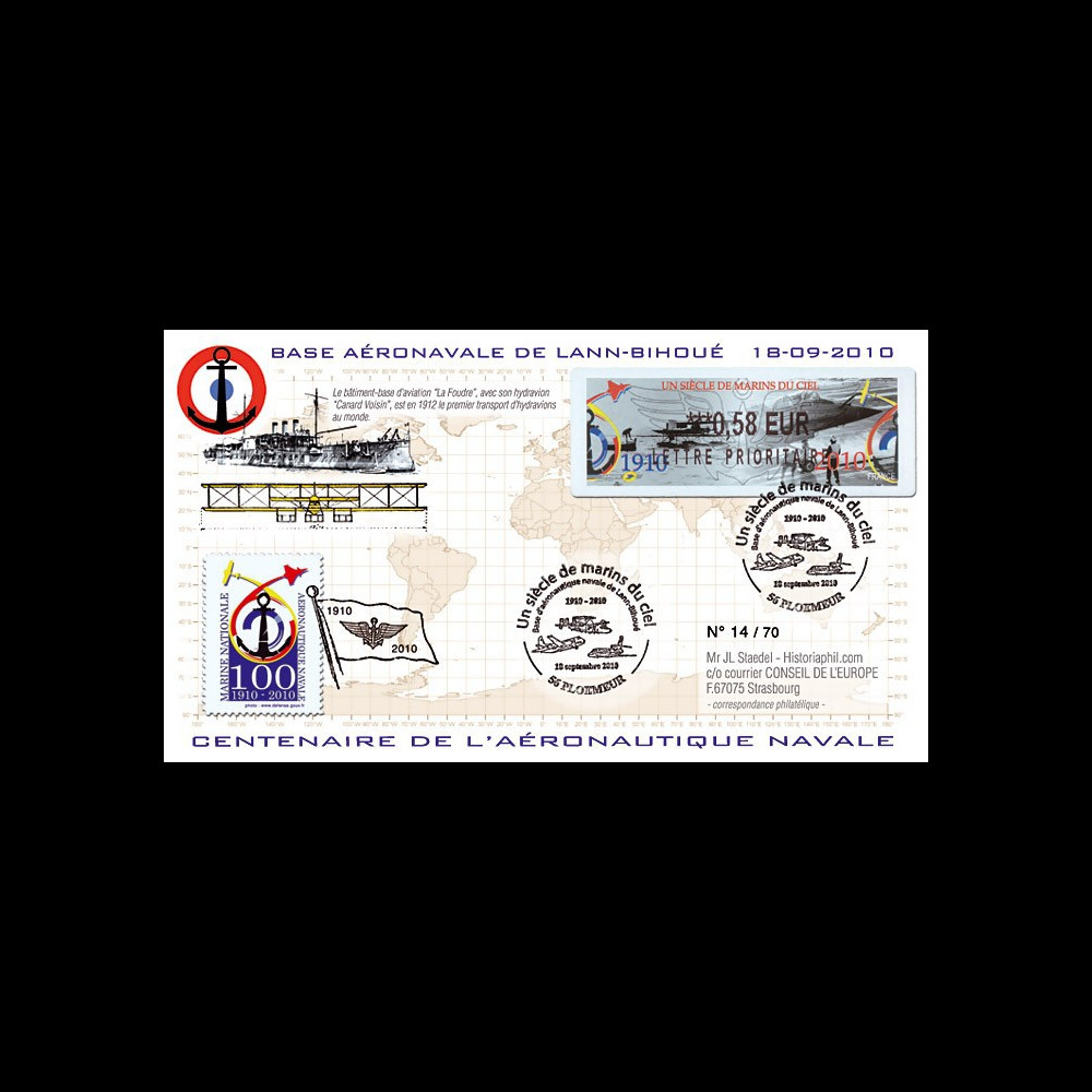 Franked TYPE 1 : France 1 value LISA 0,58€ "One Century of the Sky Mariners, 2010" postmarked in Ploemeur "Naval Air Base Lann-Bihoue / One Century of the Sky Mariners" (France) dated September 18, 2010