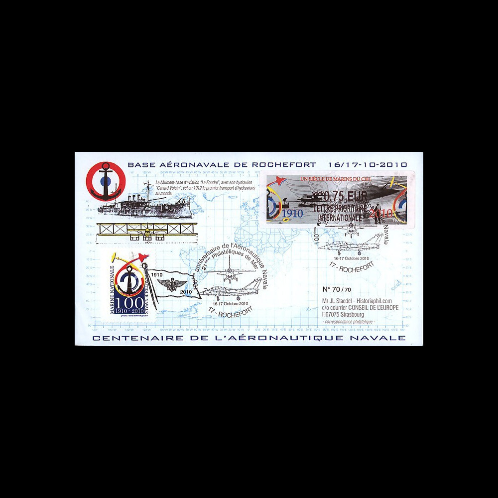 Franked TYPE 1 : France 1 value LISA 0,58€ "One Century of the Sky Mariners, 2010" postmarked in Rochefort "100th anniversary of the French Naval Air Fleet - 21th Philatelic Sea Exhibition / RAFALE M" (France) dated October 16-17, 2010