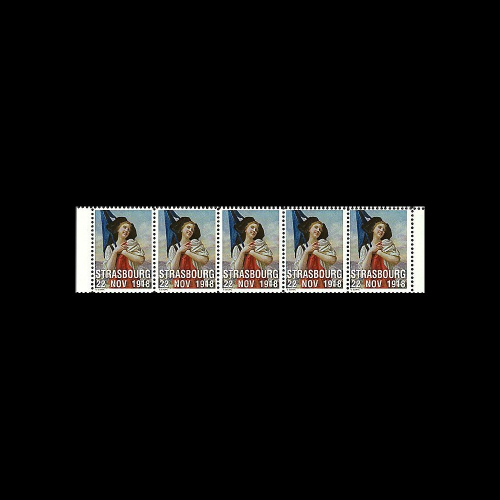 N°W1-08BD : Band of 5 gummed labels "Alsacian clutching the French flag" issued for the 90th anniversary of the liberation of Strasbourg on 22 Novembre 1918 - MINT