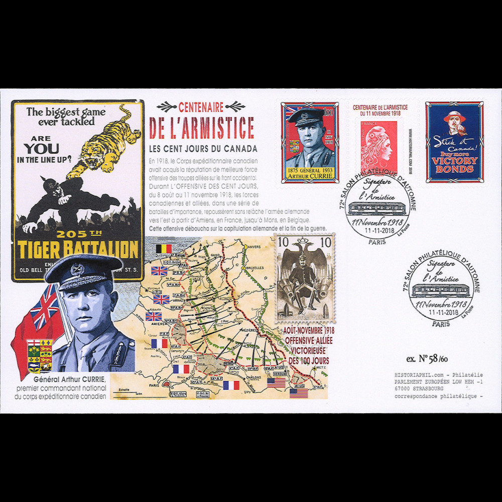 Durant l’OFFENSIVE DES CENT JOURS (ou CENT JOURS DU CANADA), du 8 août au 11 novembre 1918, sous commandement de la première armée britannique, les forces canadiennes et alliées, dans une série de batailles d’importance, repoussèrent sans relâche l’armée allemande vers l’est, à partir d’Amiens en France, jusqu’à Mons en Belgique.