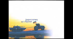 A competition had been launched in the months following the Russian military invasion of Ukraine, to choose the design of a new "war stamp". The phrase “Good evening, we come from Ukraine“ had been chosen by the Ukrainian population as the call to symbolize its resistance to the invader. This is the drawing of Anastasia Bondarets, a tractor Ukrainian towing a destroyed Russian tank, which won the undisputed victory. 900,000 people took part in the vote. According to the author, her drawing symbolizes that every Ukrainian, by virtue of his own abilities, does everything possible to bring his country closer to Victory.