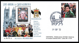 - Mourning stamp (cinderella, label) "HM The Queen ELIZABETH II 1926-2022" + cancellation "Philately - European Parliament Strasbourg (France)”