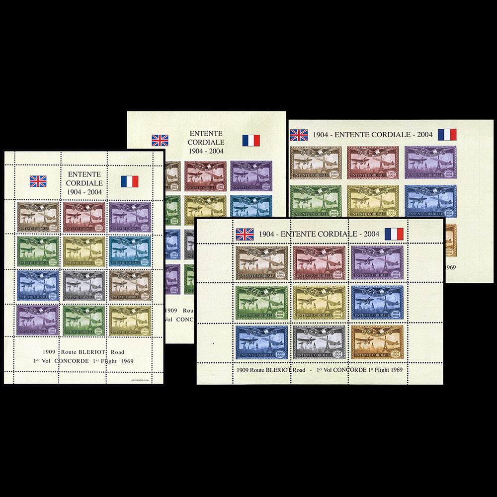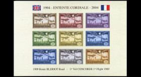 (EC04-1VND2): FRANCE 2004 - Sheet of 9 imperforated and gummed Airmail labels (Type 2 - TROPICAL GUM and large characters) “1904-2004: 100th anniversary of the Entente Cordiale between France and the United Kingdom / 1909: BLÉRIOT Route - 1969: First flight of the CONCORDE supersonic aircraft / Eiffel Tower, Paris (France) & Big Ben, London (United Kingdom)” - ft. 13.4 x 20 cm