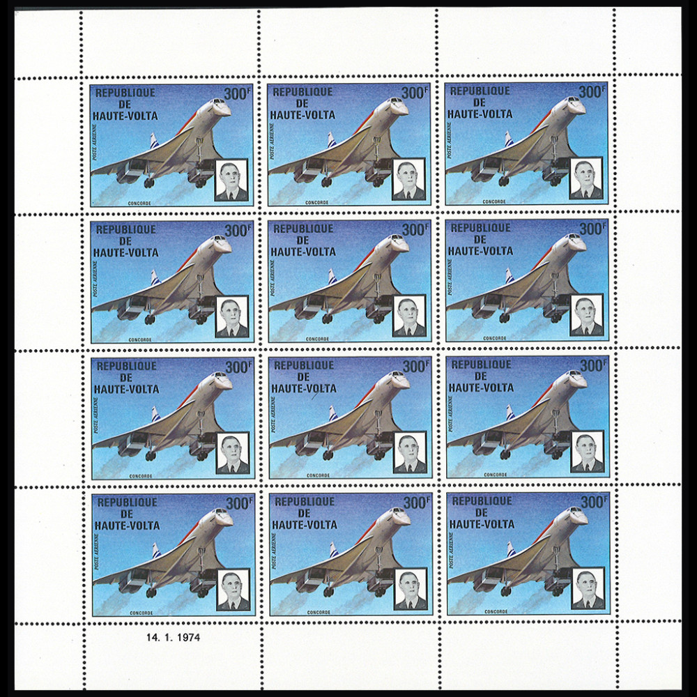 Upper Volta 1974: Sheetlet 12 x 300F Airmail “General de Gaulle, CONCORDE 001” YT 60€ (DG74-HVF)