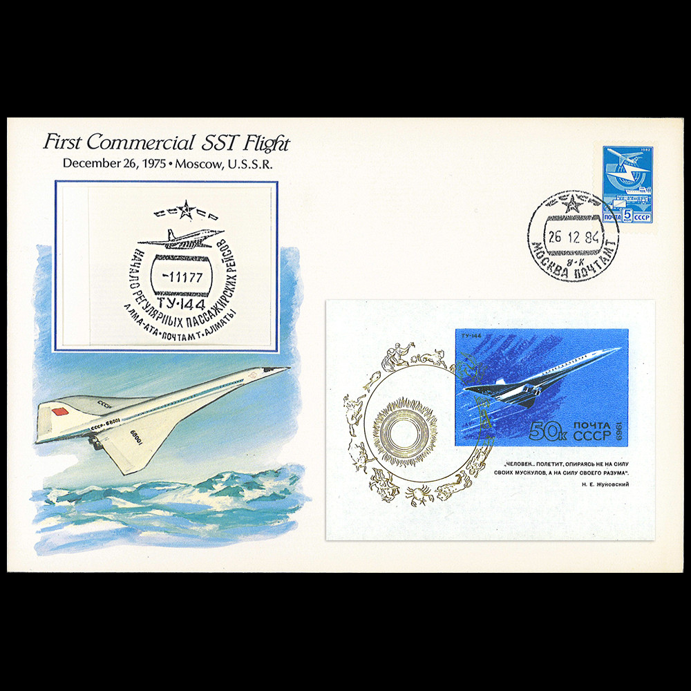- Imprint of the authentic postmark “TU-144, 1st Commercial Flight with Passengers, Alma-Ata (Kazakhstan) - Moscow 1.11.1977”