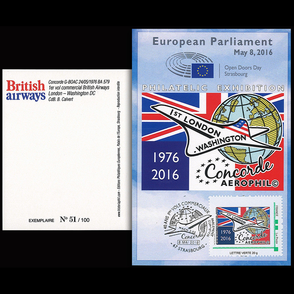 To mark the 40th anniversary of the first scheduled flights of the Franco-British supersonic Concorde, Editions Historiaphil© (the European Parliament's Philatelic Kiosk), with the support of the European Parliament, La Poste (the French postal service), and the UNION 1877 Philatelic Association, presented a temporary philatelic exhibition during the European Parliament's Open Day in Strasbourg on May 8, 2016. The exhibition was extended during the plenary session from May 9 to 12, 2016. It was entitled "40 years ago, Concorde ushered Europe into the era of supersonic commercial aviation (1976-2016)."