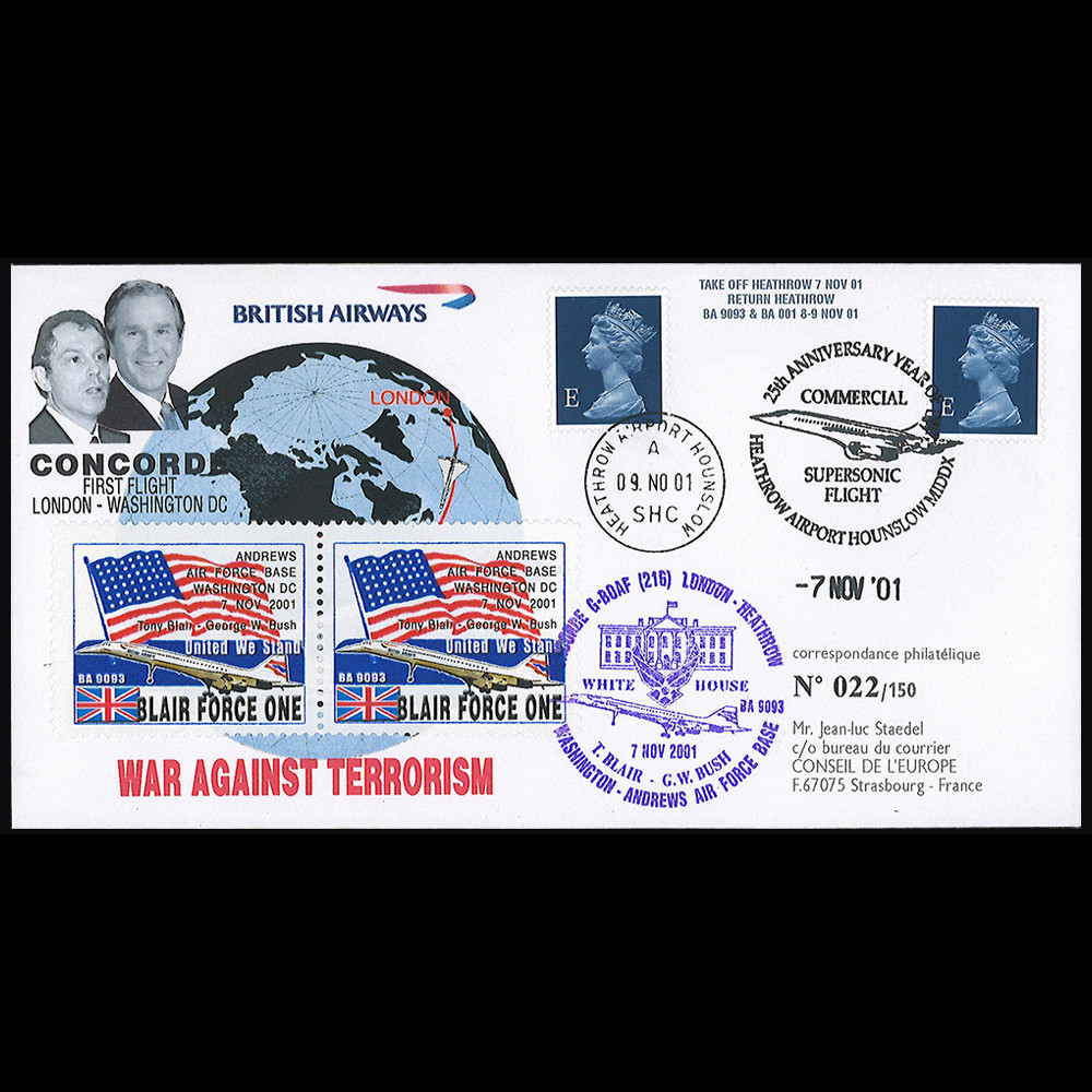 - Commemorative cancellation of the flight on a pair of perforated labels (cinderellas) "BA 9093 Concorde BLAIR FORCE ONE"