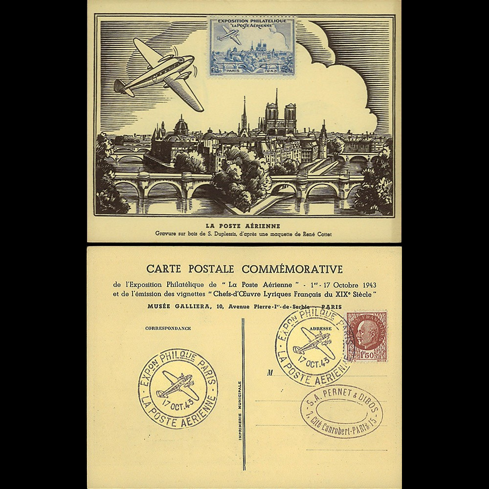 N°W2-FR517AV1: French State 1943 - official postcard "LA POSTE AERIENNE Philatelic Exhibition" Paris, 1-17.10.1943