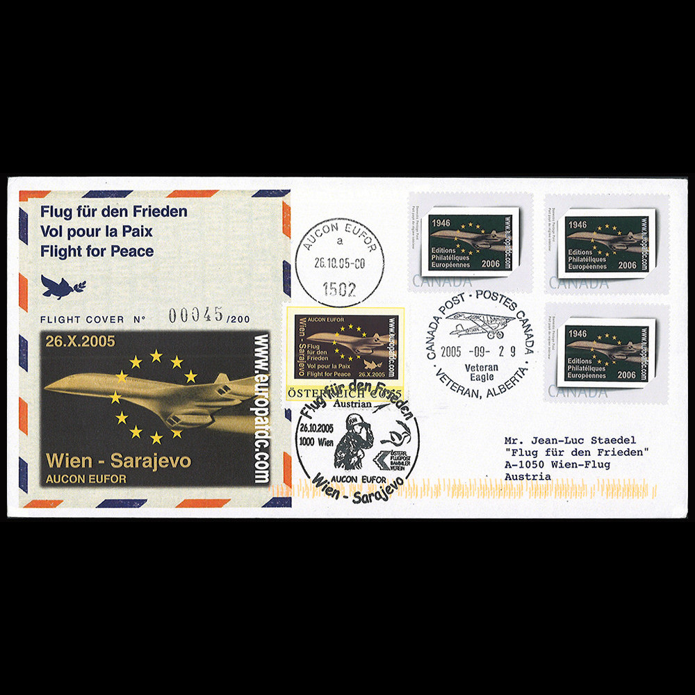 CO-RET22: (PE510a) Pli de transit CANADA - AUTRICHE, voyagé à bord du Vol spécial Austrian Airlines 'Flug für den Frieden' (Flight for peace) WIEN (Austria) - SARAJEVO AUCON EUFOR (Austrian battalion of the peace forces of the European Union in Bosnia Herzegovine).