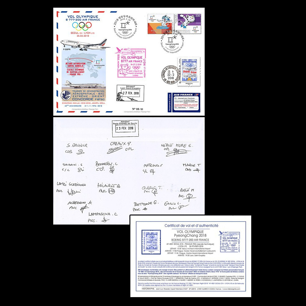 + authentic signatures of the 15 crew members of Olympic flight AF 4001 Seoul - Lyon on the back (Captain (CDB) : S. BRUNIER, Copilots (OPL) : S. CAZAUX et Hervé MURE E., Head of Main Cabin (CCP) : L. BONNETON, Chief Cabin (CC) : S. SAIDANI and F. MATRAND, (CAD) T. MARLE, Commercial Navigant Staff (hostesses and stewards / PNC) : S. LAMRI GUEDIOURA, B. HILAIRET, T. QUERIOT, M. ROBIN, K. ACHEZEGAG, C. LAMPASONA, G. BOTTONE and L. GARIN)