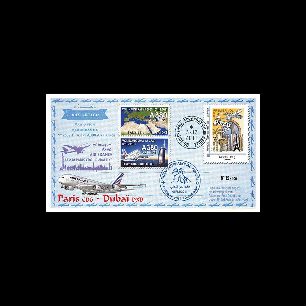 + Violet cachet "Airbus A380 Air France - Maiden Flight AF3830 Paris CDG - Dubai DXB" (France) dated December 5, 2011