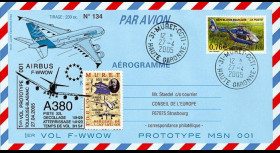 250 aerophilatelic covers “End of production of the A380“, carried from the European Parliament in Strasbourg via Paris CdG (France), on board the 1st flight of the Air France A380 to Atlanta