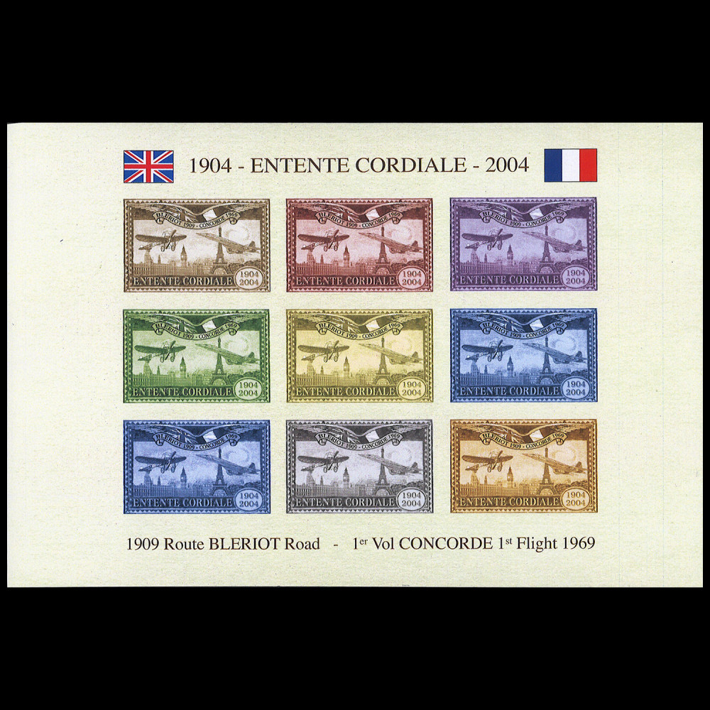 N°EC04-1VND2 : FRANCE 2004 - Sheetlet of 9 IMPERFORATED and gummed labels / cinderelas (Type 2 - TROPICAL GUM and large print) "1904-2004 : 100th anniversary of the Cordial Agreement between France and United Kingdom / 1909 : BLERIOT Road - 1969 : First Flight Supersonic Aircraft CONCORDE / Eiffel Tower, Paris (France) & Big Ben, London (United Kingdom)"