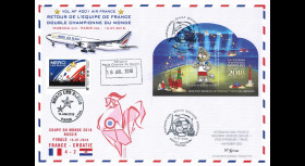 They carry a mixed Russia - France postage, made up of one of the two Russian blocks “2018 FIFA World Cup Russia ™“ and one of the two French stamps “Merci les Bleus” issued for the FIFA World Cup 2018 ©, canceled with special stamps from Moscow Domodedovo Airport “Finale France - Croatia“ 15.07.2018 and arrival in Paris “Merci les Bleus“ July 16, 2018.
