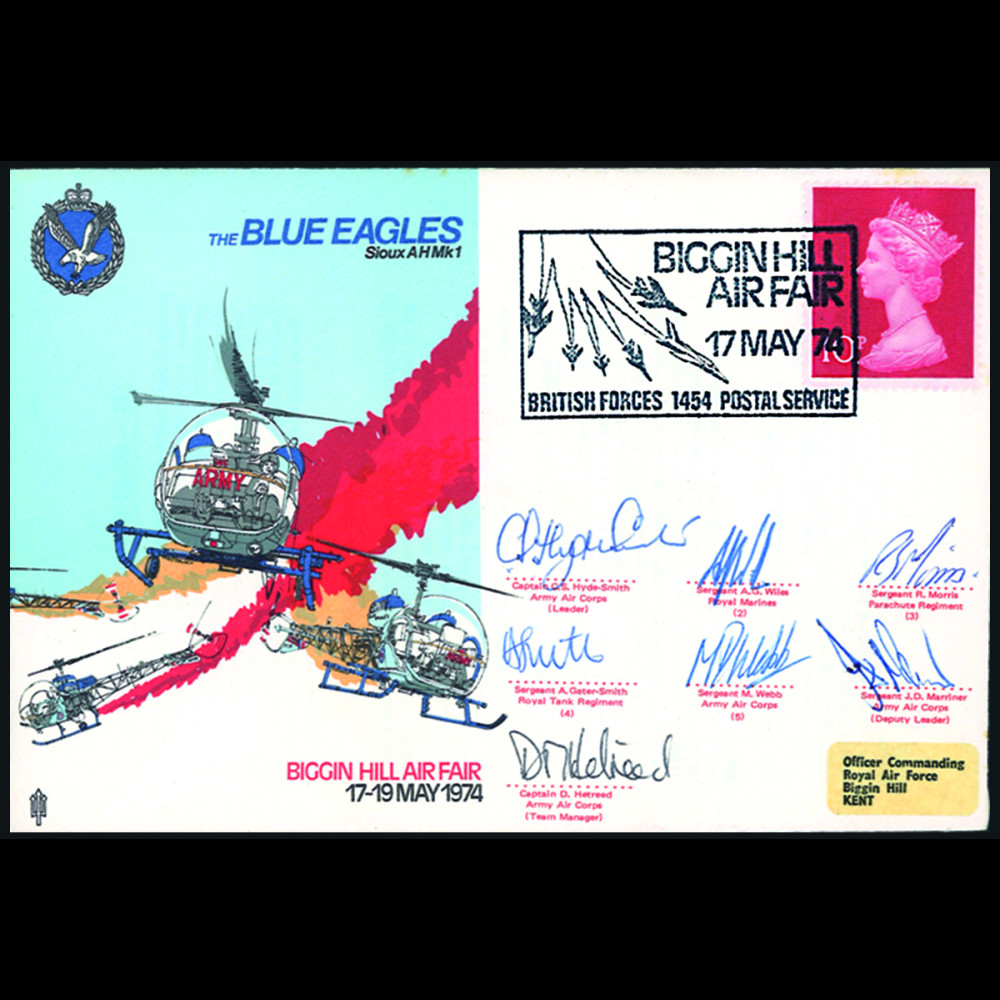 - 7 authentic signatures of the 5 pilots, the Manager and the Deputy Leader of the “Blue Eagles” formation Leader C. S. Hyde-Smith, No. 2 A. G. Wiles, No. 3 R. Morris, No. 4 A. Gater-Smith, No. 5 M. Webb, Deputy Leader J. D. Marriner and Team Manager D. Hetreed. + signature Cdt RAF Museum + certificate