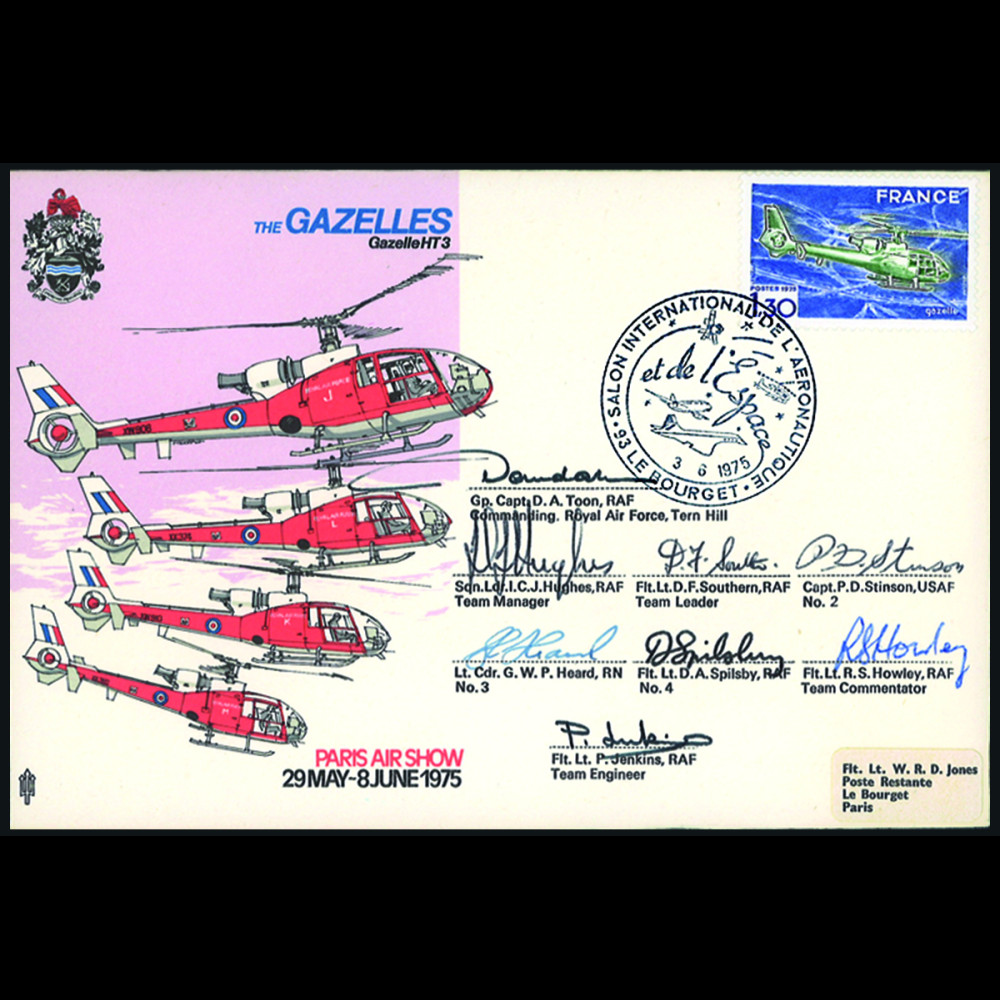 - 8 authentic signatures of the 4 pilots, the RAF Commander, the Technical Chief and the commentator of the “Gazelles” formation RAF Commanding D. A. Toon, Team Manager I. C. J. Hugues, RAF Team Leader D. F. Southern, USAF No. 2 P. D. Stinson, RN No. 3 G. W. P. Heard, RAF No. 4 D. A. Spilsby, RAF Team Commentator R. S. Howley, RAF Team Engineer P. Jenkins + Project Officer signature on reverse + certificate