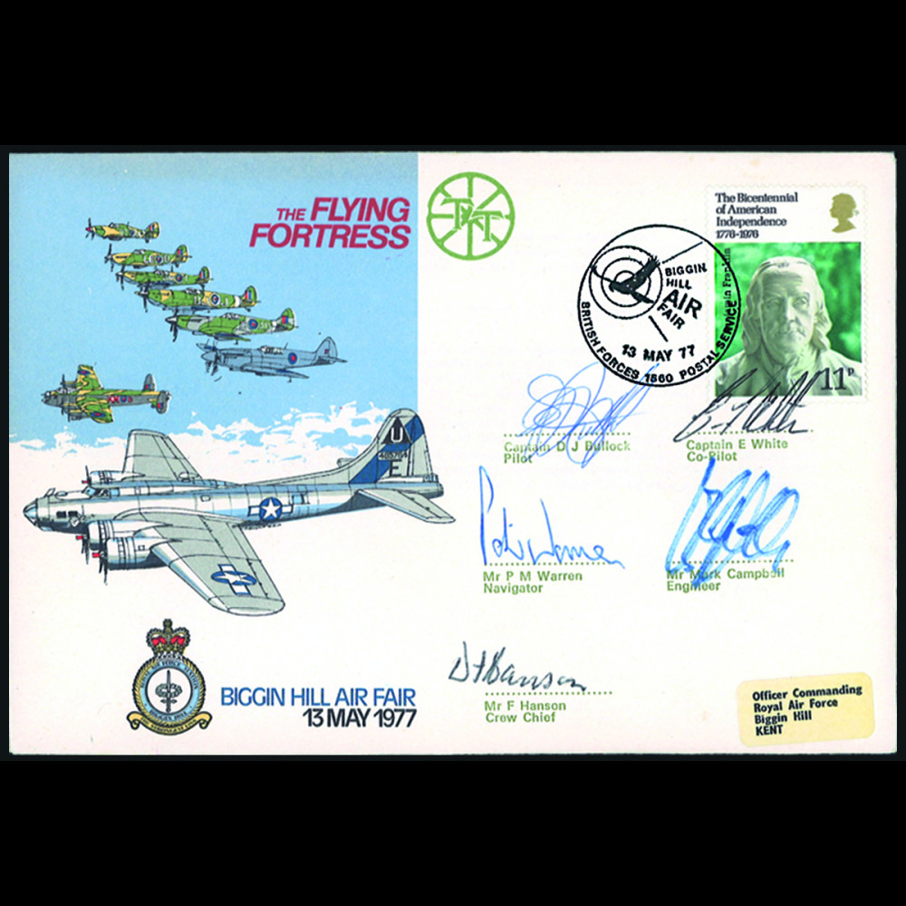 - 5 authentic signatures of the crew of the “Flying Fortress” (Captain, pilot, co-pilot, navigator, flight engineer) Pilot D. J. Bullock, Co-Pilot E. White, Navigator P. M. Warren, Engineer Mark Campbell, Crew Chief F. Hanson. + signature Cdt. RAF Museum on reverse + certificate
