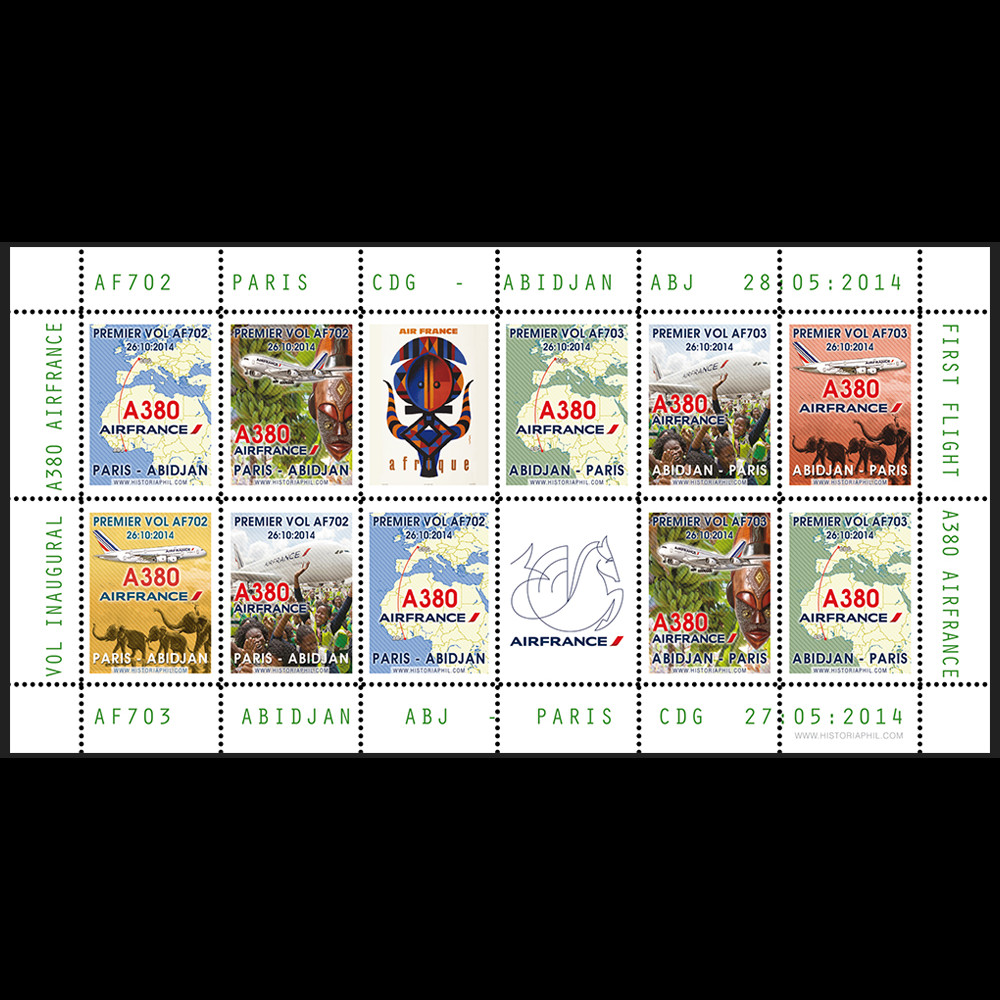 A380-255FD: Sheet of 12 perforated and gummed Airmail labels (cinderellas) “1st regular flight A380 Air France AF702 Paris CDG - Abidjan ABJ and AF703 Abidjan ABJ - Paris CDG 26/27.10.2014“