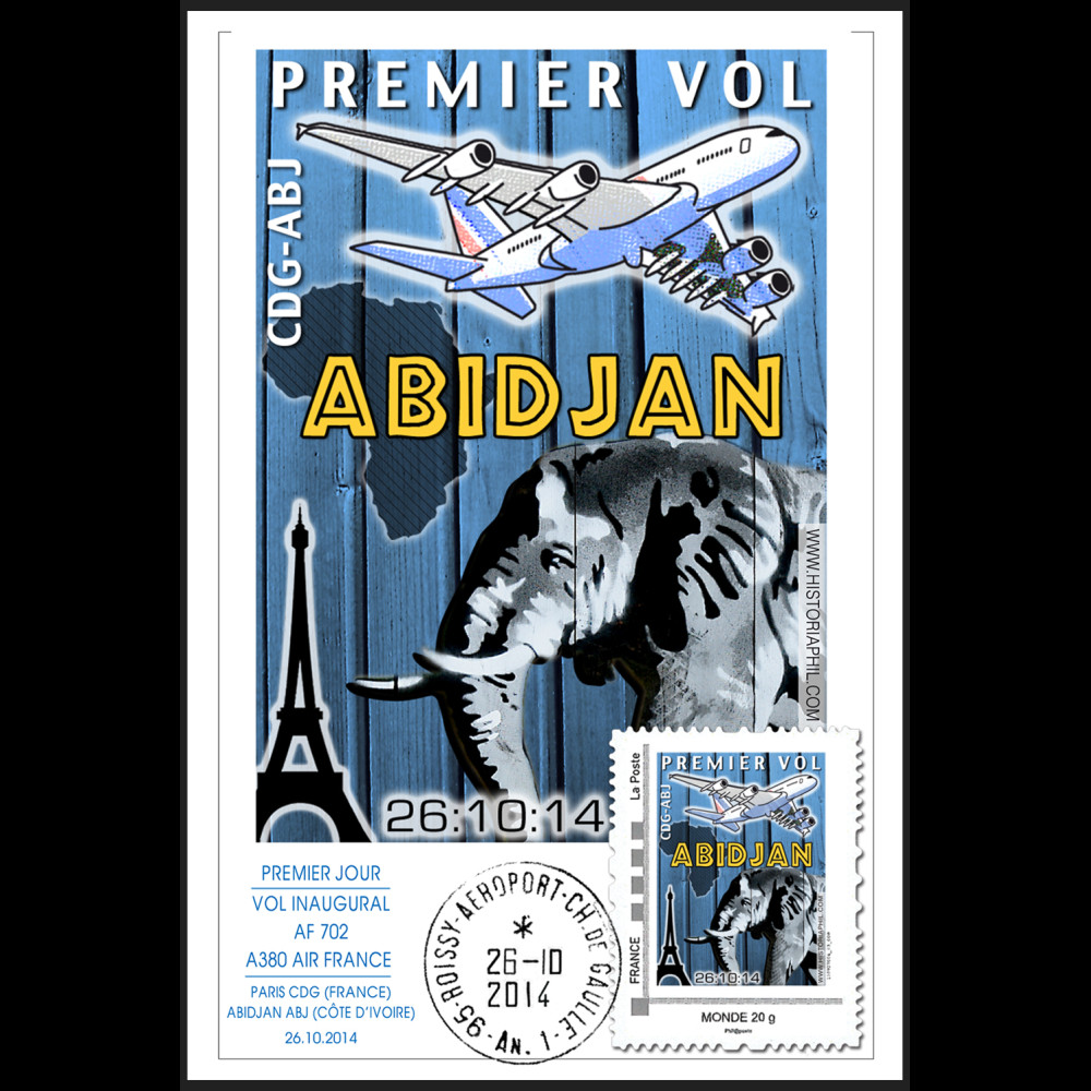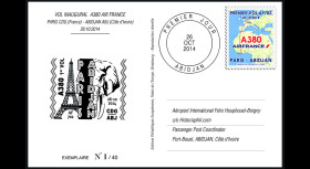 A380-257: France maximum card “on board 1st Flight A380 Air France AF702 Paris CDG - Abidjan ABJ 26.10.2014”.