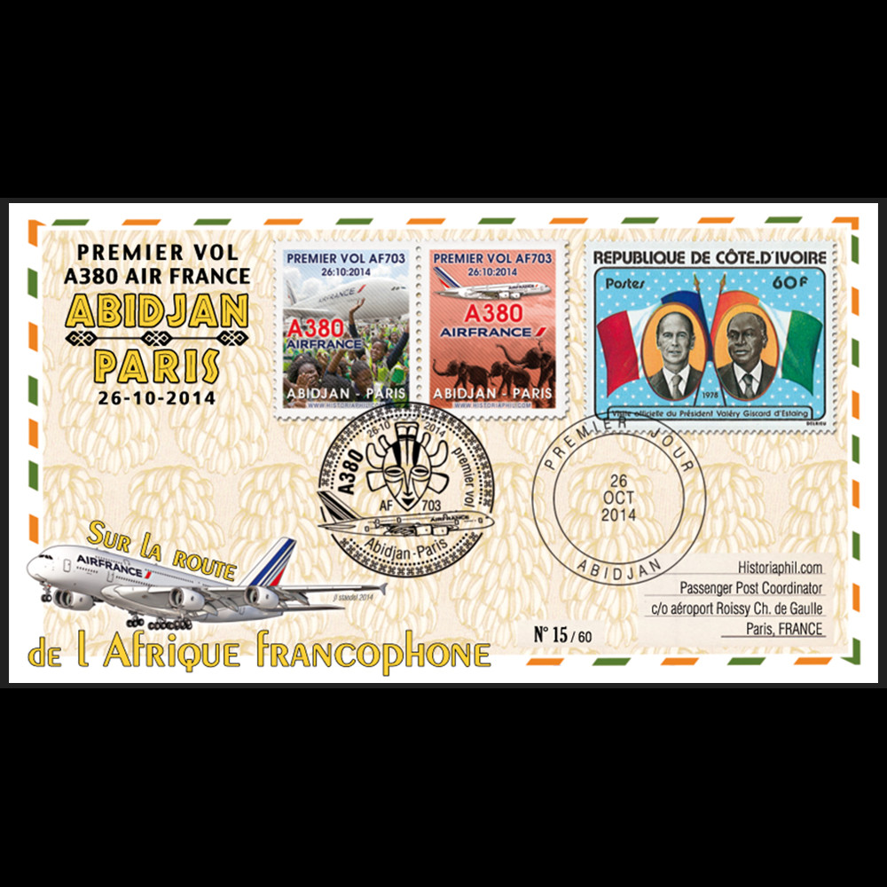 A380-260T2: Special cover “on board 1st regular Flight A380 Air France AF703 Abidjan ABJ - Paris CDG, 26.10.2014“