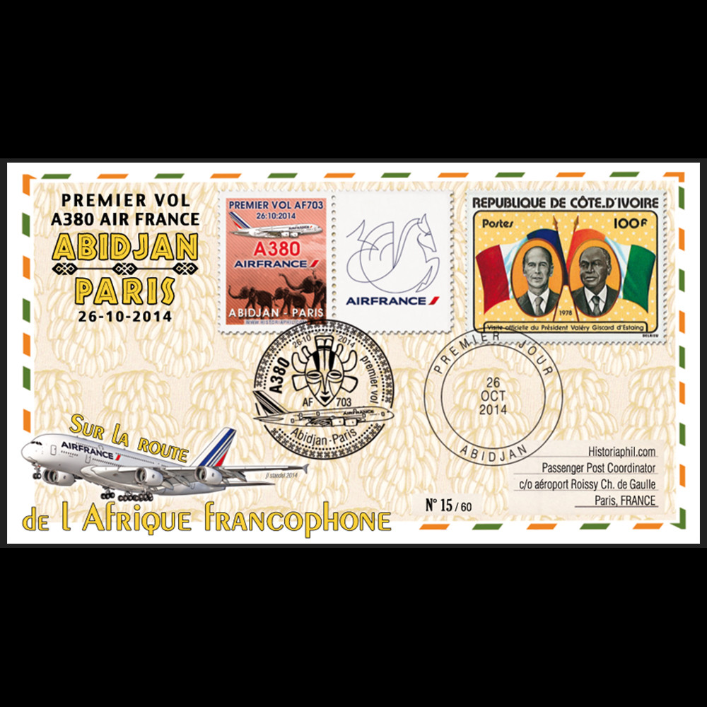 - Cancellation "1st Day Abidjan" 26.10.2014 - BLACK stamp “1st flight A380 AF 703 Abidjan-Paris”
