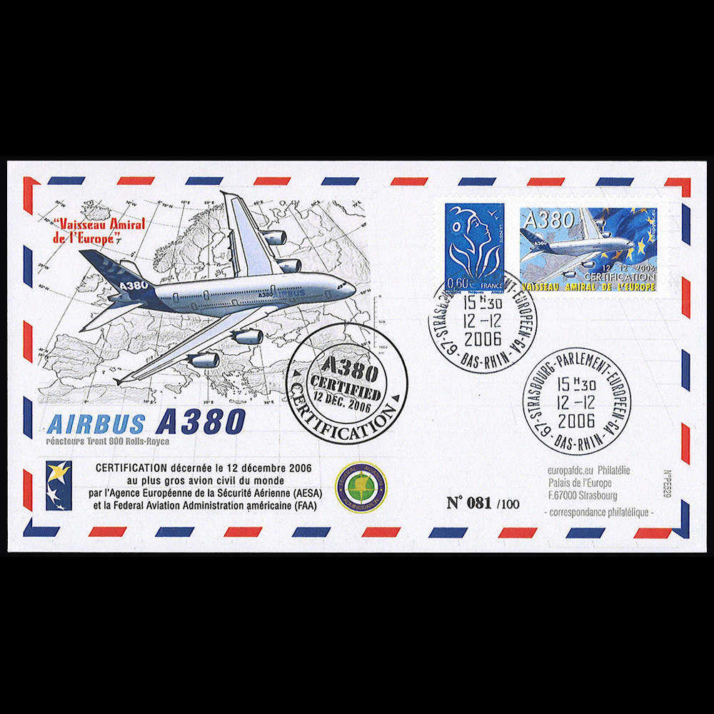 12.12.2006: The European Aviation Safety Agency (EASA) and the American Federal Aviation Administration (FAA) jointly awarded, on December 12, 2006, type certification to the largest civil aircraft in the world and the flagship of aeronautical cooperation European, the Airbus A380. This certification from the two main certification bodies concludes a demanding test program carried out brilliantly by the A380, during which its structure and systems were tested beyond design objectives to ensure that the The device meets all certification requirements. (Sources www.aeroweb-fr.net)