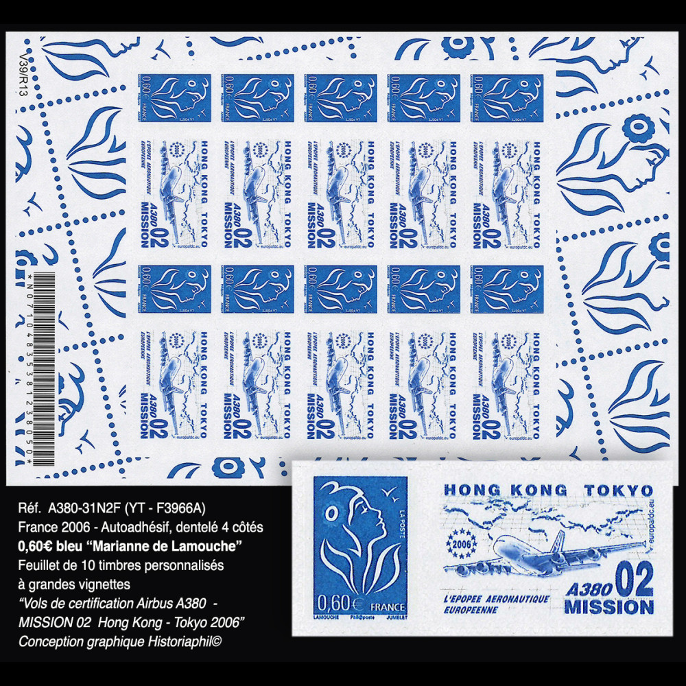 N°A380-31N2F: FRANCE 2006 - COLLECTOR's SHEET of 10 PERSONALIZED ADHESIVE STAMPS 0,60€ blue "Marianne de Lamouche" with adjoining large label "Airbus A380 Test flights - Mission 02 - HONG KONG - TOKYO 2006"