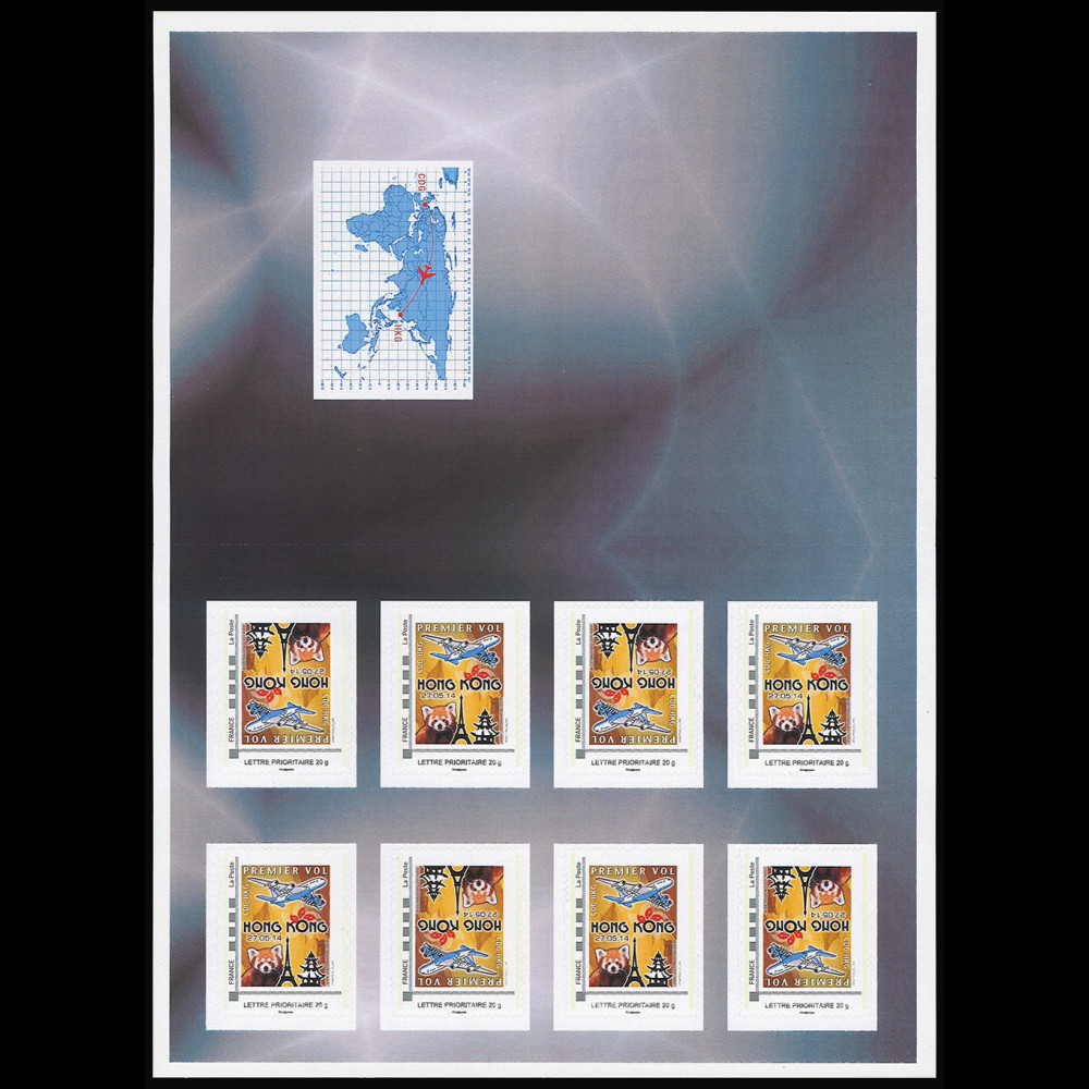 N°A380-262C8: FRANCE 2014 Collector's Booklet of 8 Personalized Postage Stamps (TPP) Priority Letter 20g TÊTE-BÊCHE YELLOW "05.27.2014: Inaugural flight Airbus A380 Air France AF 188 Paris CDG (France) - Hong Kong HKG (China)/ Eiffel Tower & Red Panda" (140 x 297 mm; unfolded)