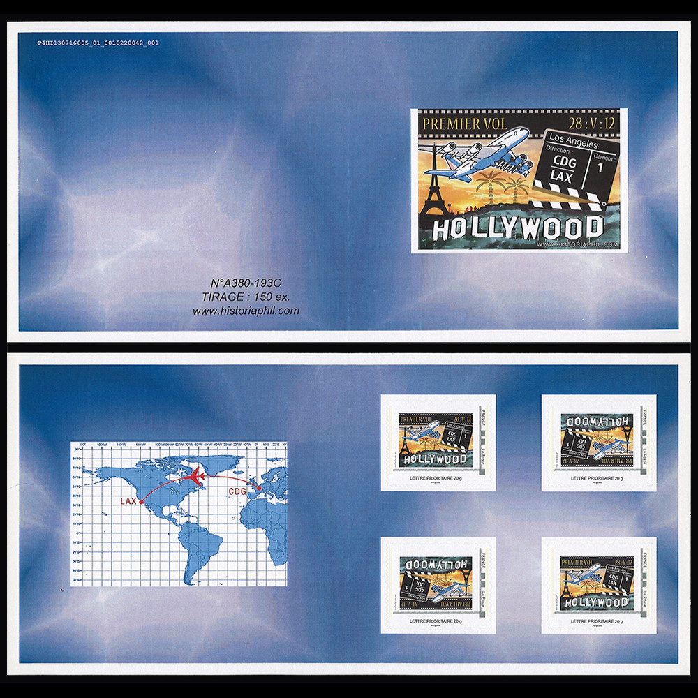 N°A380-193C: FRANCE Collector's Booklet of 4 Personalized Postage Stamps (TPP) Priority Letter 20g TÊTE-BÊCHE "05.28.2012: First flight Airbus A380 Air France Paris CDG (France) - Los Angeles LAX (USA) / Eiffel Tower & Cinema Hollywood" (140 x 297 mm; unfolded) 2012