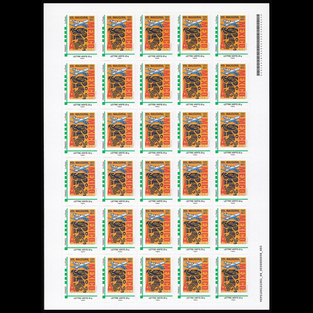 N°A380-293P: FRANCE 2016 - Collector's Sheet of 30 Personalized Postage Stamps (TPP) Green Letter 20g with ORANGE background "12.01.2016 - 1st flight Airbus A380 Air France Paris CDG (France) - Mexico MEX (Mexico) / Eiffel Tower and Asteque Eagle"