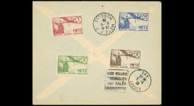 - Postage France 4 airmail Labels 50c blue, 1fr red, 2fr brown, 5fr green "METZ - Air Service June 1938 - Twin-engine plane flying over Metz Cathedral"