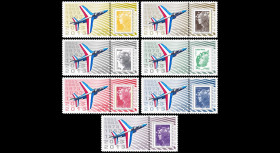 - Postage France 4 airmail Labels 50c blue, 1fr red, 2fr brown, 5fr green "METZ - Air Service June 1938 - Twin-engine plane flying over Metz Cathedral"