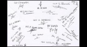 on the back: Authentic signatures of 23 crew members of the flight AF 688 AIR FRANCE (Captain of Flight (CDB): P. SCHLAIFER, Pilot (OPL) JM JULIEN, Main Cabin Chief (CCP): S. BONNETÉ, Chief of Cabin (CC/CIC): D. STASI, L. LENS, Cabin Crew (hostesses and stewards / cabin crew): J. GELLIBERT, A. DAMBRIN, BONNICI, FOURNIER, C. COUËDEC, G. COLAS, E. BOHARD- TAPIAU, K. VINAY, A. FRATANI, TEXEIRA, ENGRAND-CLEMENT, S.MADEC, LEFUSTEC, CH. MOREAU, JC PRIOL, RONDEAU, DUPONT, N. DRAR)