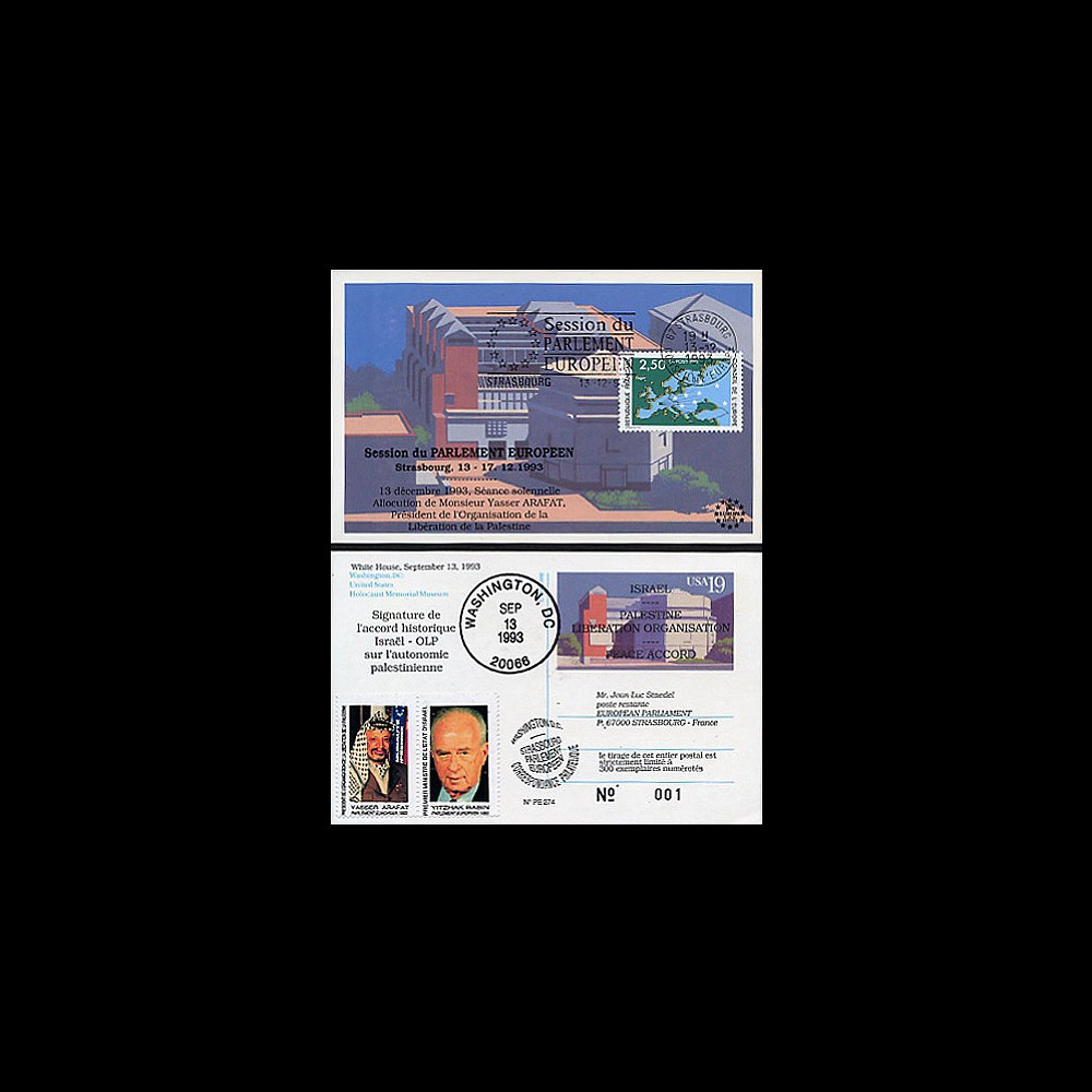 Pour immortaliser cette date historique pour la Paix, nous avons fait oblitérer du 13.9.1993 à Washington une série spéciale de 300 entiers postaux américains «Musée Mémorial de l'Holocauste, Washington DC».