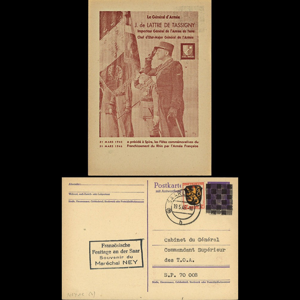 NEY46-1C : Prepaid card mit Antwortkarte (reply card) 6Pf violet overload “Hitler caged“ (P302) “General de Lattre de Tassigny - Crossing of the Rhine by the French Army“