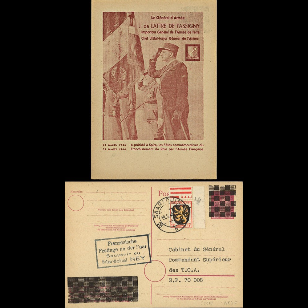 NEY46-3CF : Prepaid card Postkarte (card) 6Pf pink propaganda slogan with double overload “Hitler caged“ (P314) “General de Lattre de Tassigny - Crossing of the Rhine by the French Army“